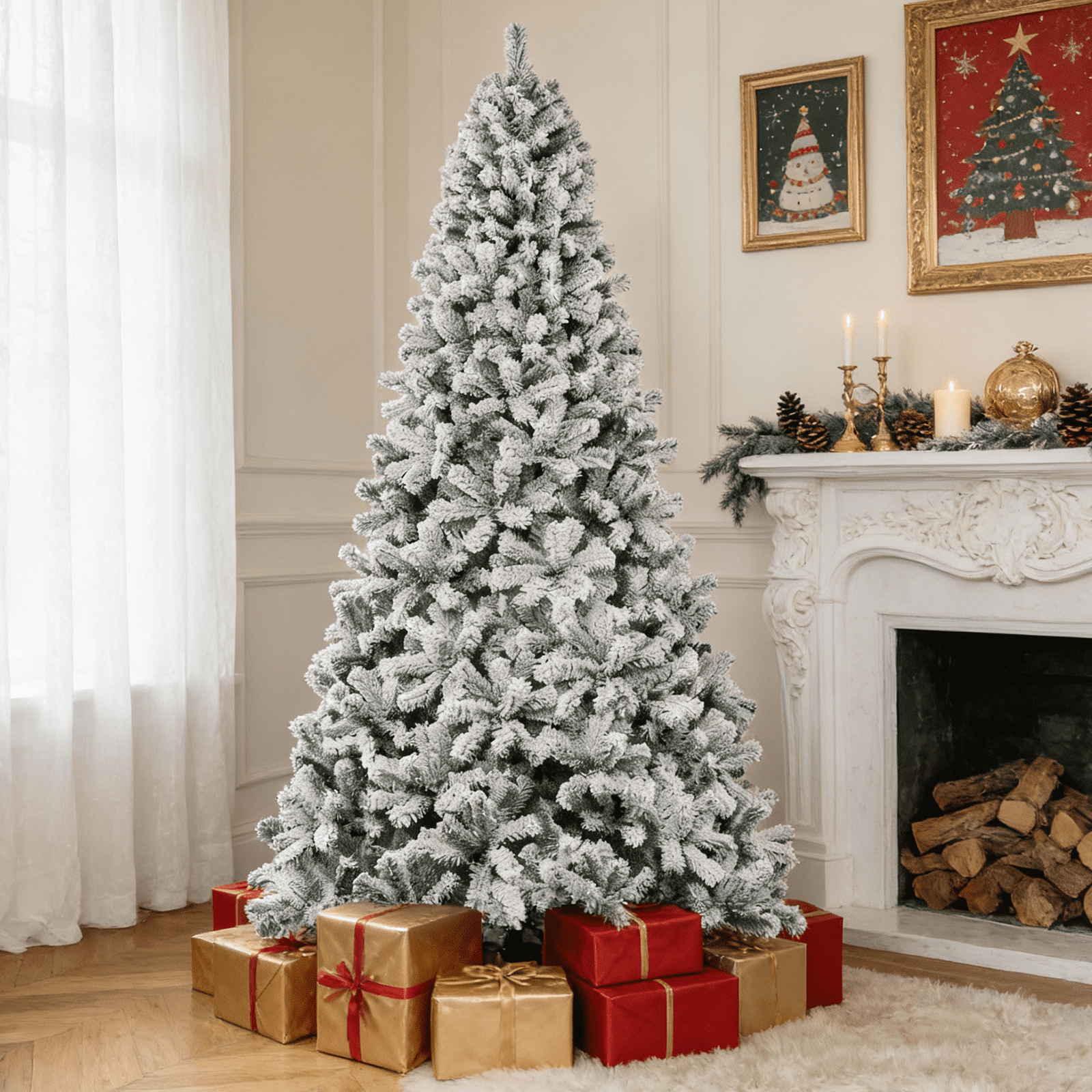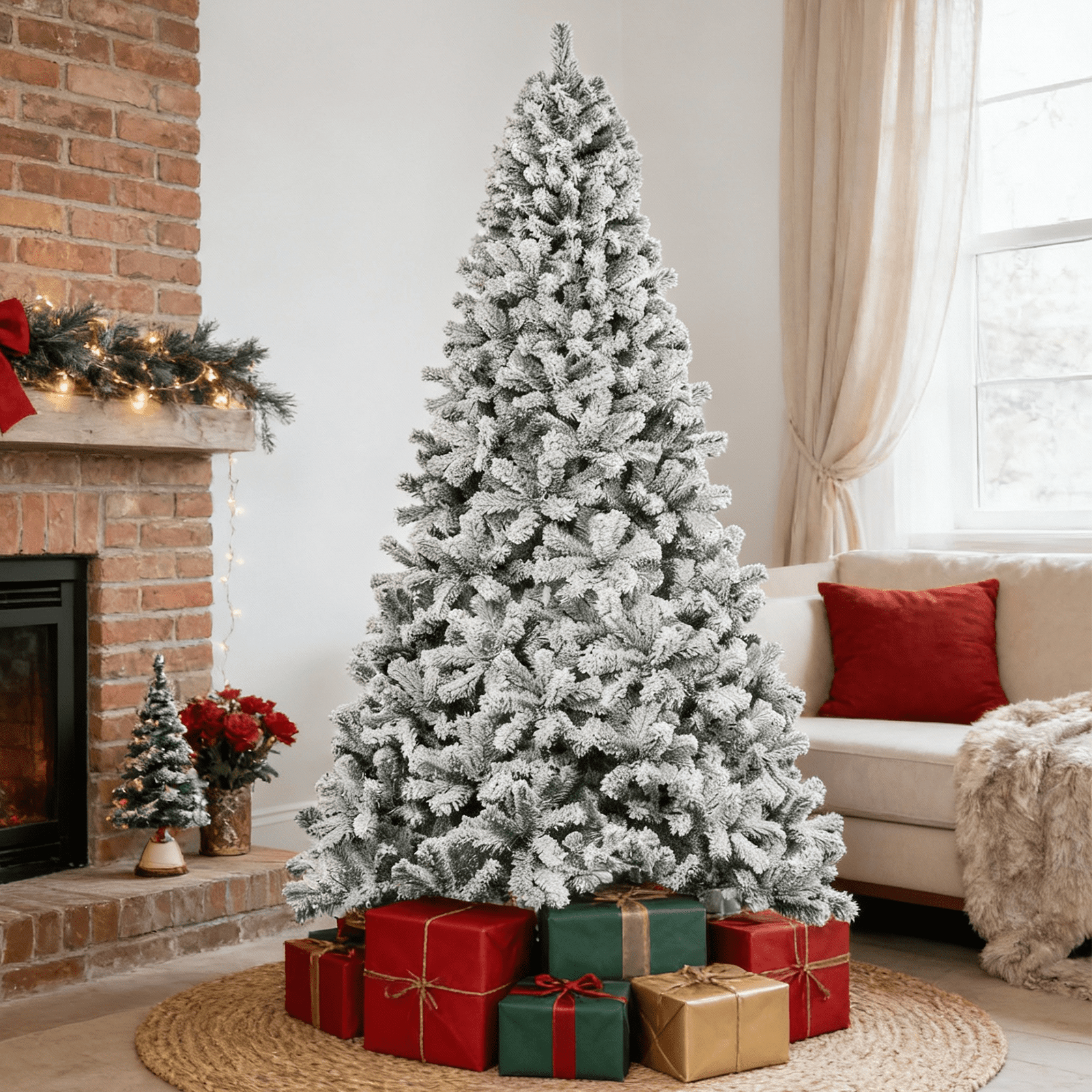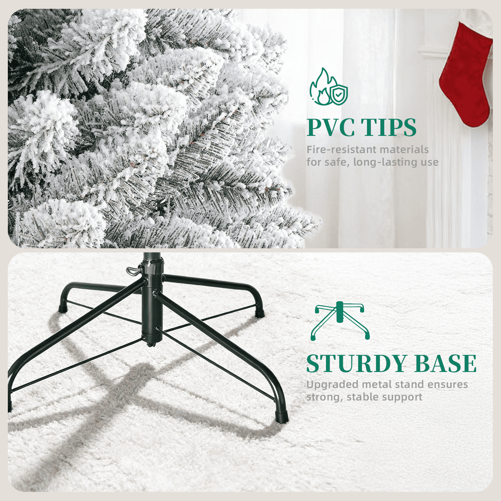 The snow flocked tree is equipped with an X-shaped iron stand that improves stability and keeps the tree standing upright. Compared to other plastic bases, this metal stand is more stable and resistant to breakage.