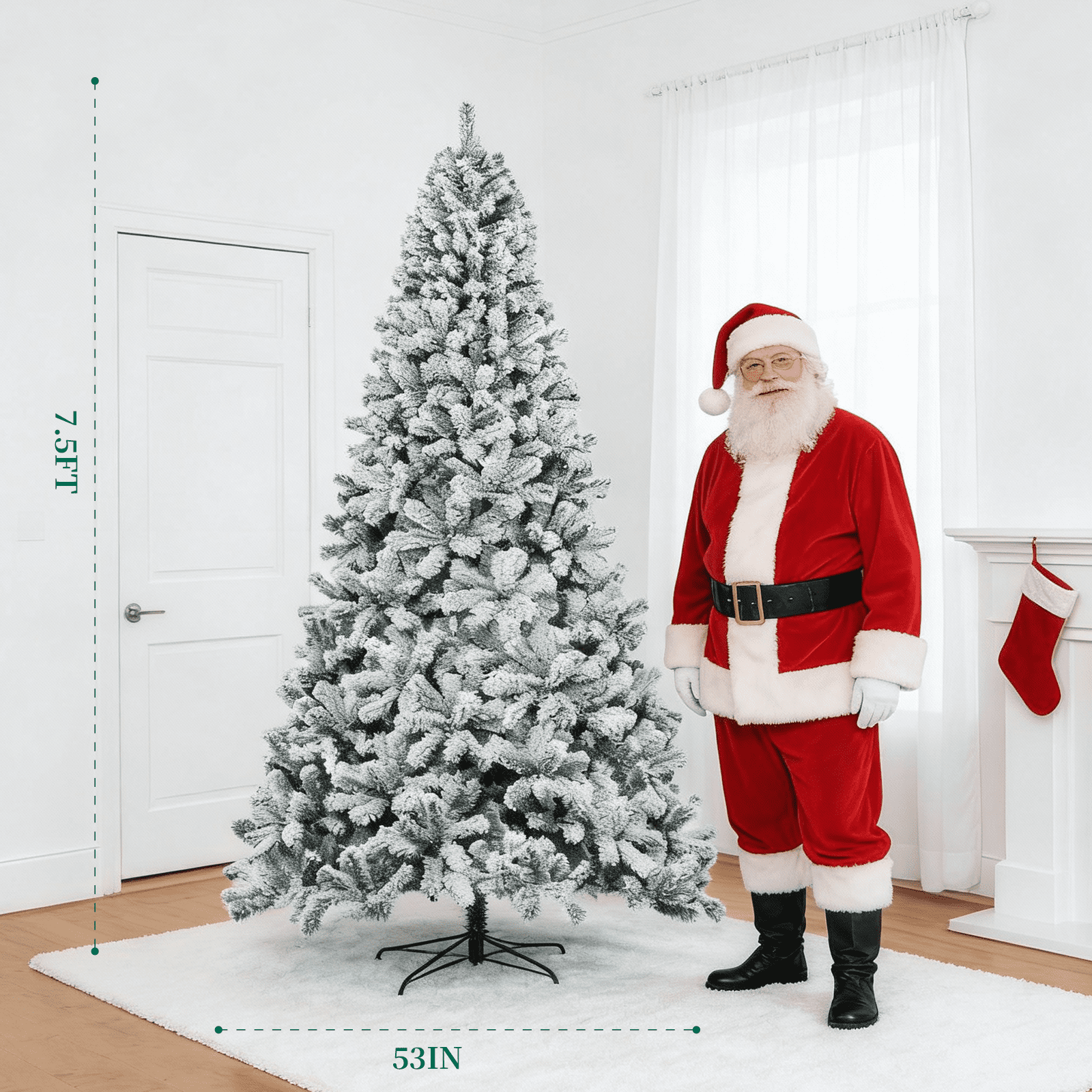 This is a 7.5 ft Christmas tree that is designed with 1450 branch tips and snow flocked leaves to offer an elegant and lush appearance.