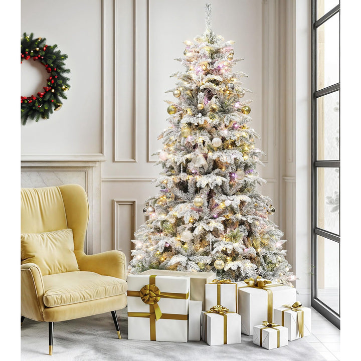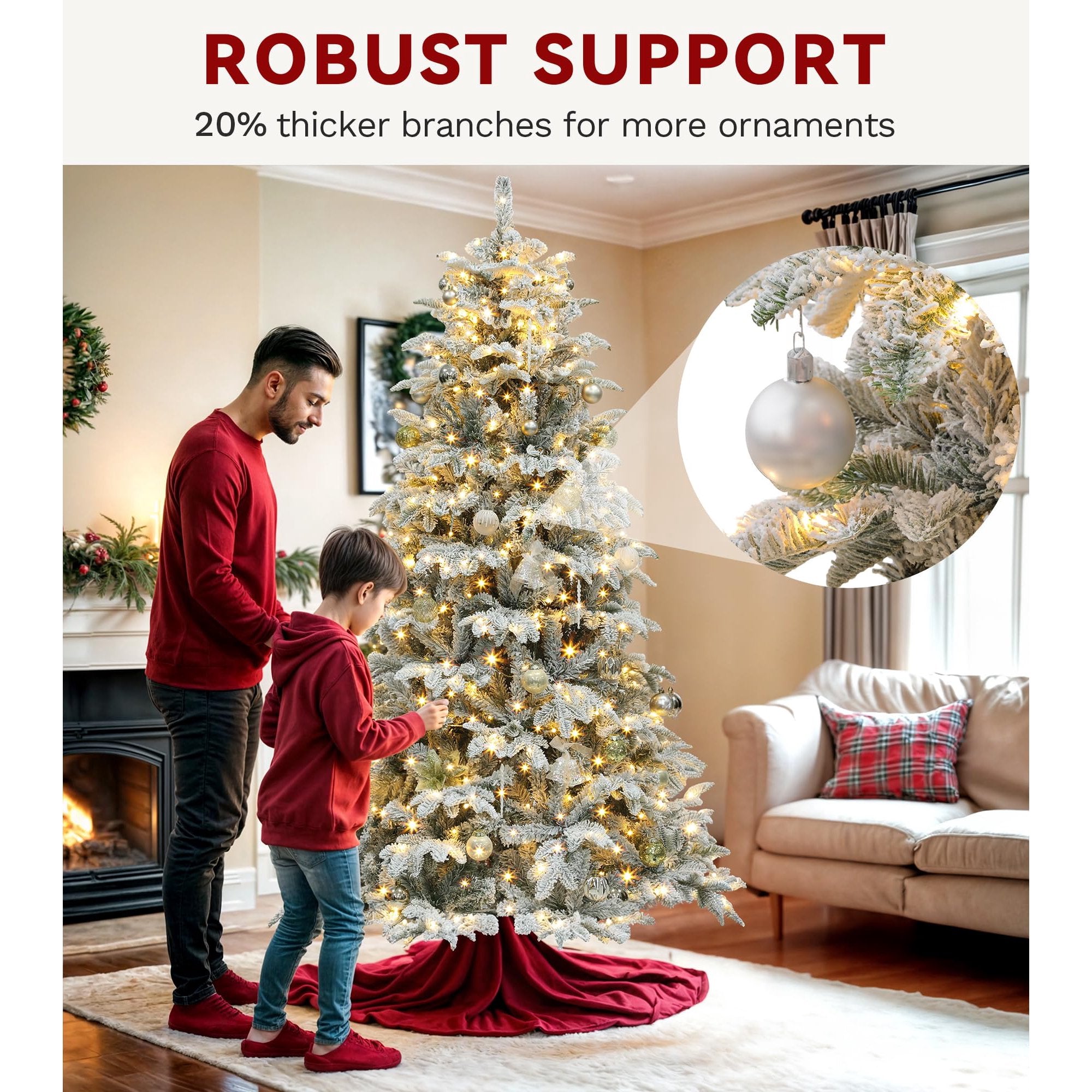 Bring winter charm indoors with this 6FT Pre-Lit Snow Flocked Christmas Tree, featuring 1350 lush PE & PVC tips and 300 multi-mode LED lights with remote control. The layered design, sturdy metal stand, and hinged structure make it both elegant and easy to set up¡ªideal for home, office, or festive events.