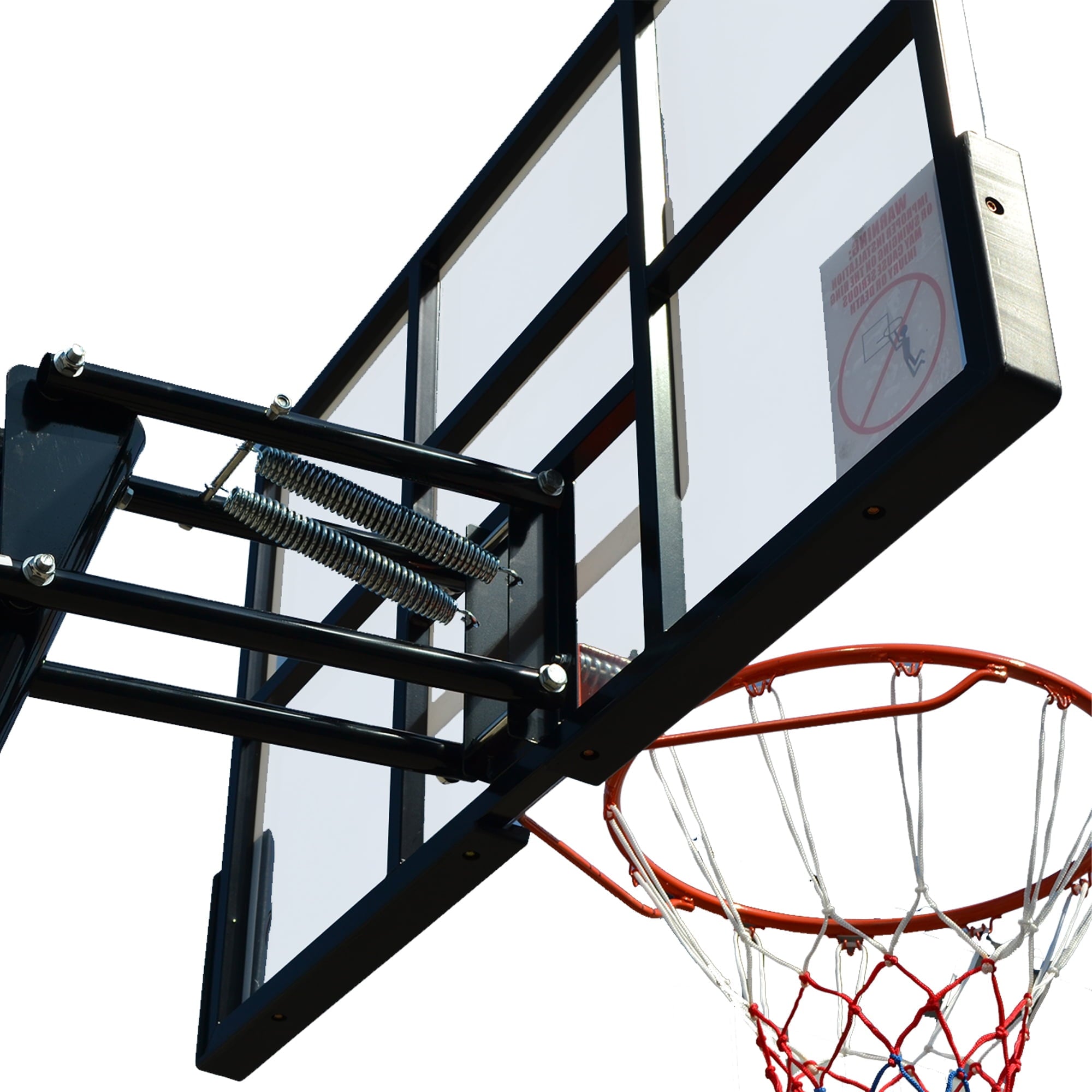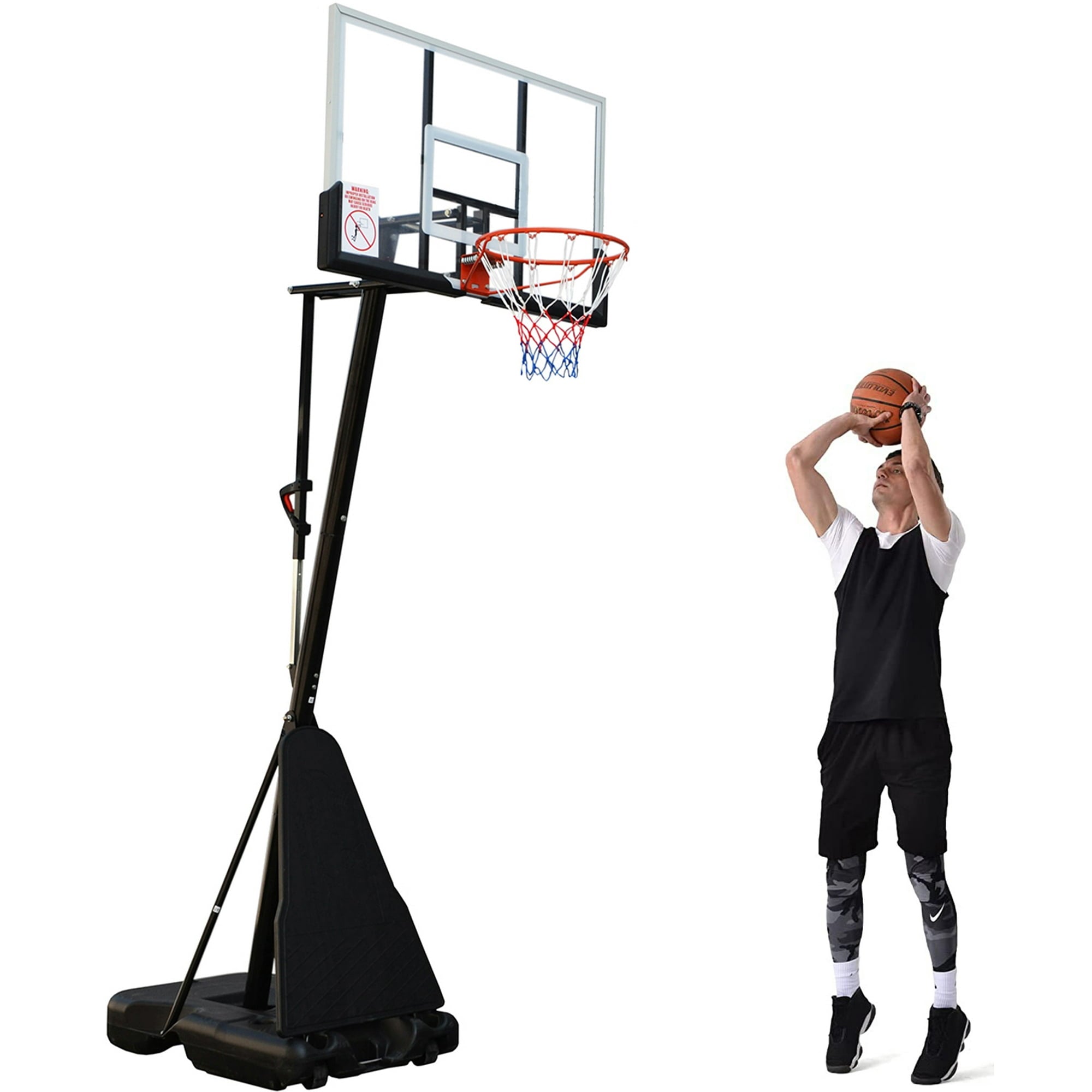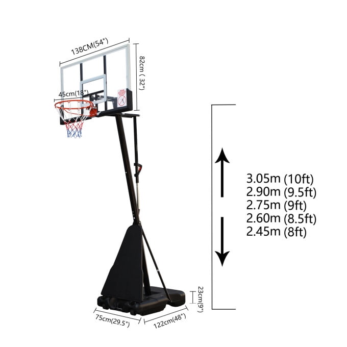 We highly recommend watching the installation video. Vebreda 54in Portable Basketball Hoop with Polycarbonate Backboard.Built to withstand endless pickup games in the driveway, this portable hoop system has a durable polycarbonate backboard. Support rod adopts 2.6in steel designed, enough for bad weather and intense games for long-term use. Lift system easy height adjustments from 7.5 ft. to 10 ft. for different ages or heights youth children play. This portable system gets its stability from a 36-gallon base equipped with two wheels. You can wheel this hoop wherever you want to play basketball. This basketball hoop is great for all ages and skill levels! All parts and tools needed for assembly are included, but it's recommended to use your own tools for quicker assembly. This 54" portable basketball hoop is a must have for kids, teens, or adults who enjoy the game of basketball, but may have limited space to play. Practice your jump shot, 3 pointer and layups right in your backyard. DO NOT hang on rim. This portable basketball hoop is built to last. Weather and water resistant for all-season use.