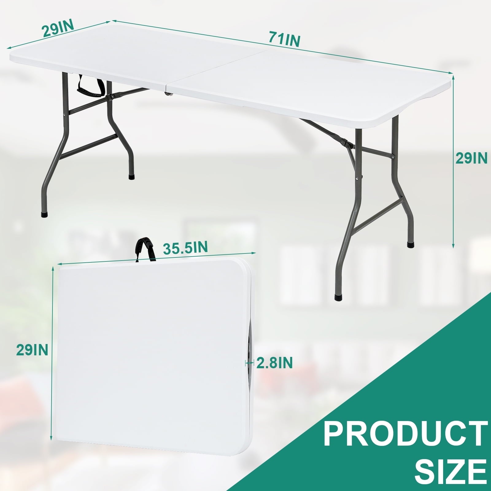 VERSATILE:This 6 ft Folding Table can be used indoors and outdoors. Table folds in half with a convenient carrying handle for easy transportation and compact storage. It is very suitable for dining, buffets, flea markets, garage sales, wedding banquets, holidays or graduation parties, family gatherings, etc.