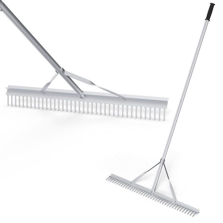 This 36-inch aluminum landscape rake is designed for efficient and versatile yard work. Made with a premium rustproof aluminum frame, it¡¯s lightweight yet sturdy enough to handle heavy-duty tasks. The reinforced triangular structure and 1.1" thick pole ensure exceptional stability. With 36 sharp tines on one side for grading and a smooth leveling edge on the other, it adapts to various landscaping needs¡ªfrom spreading soil, mulch, and gravel to leveling sand or sod. The 68-inch long handle reduces back strain, and its detachable 2-section design makes assembly, storage, and transportation easy. Ideal for gardens, lawns, beaches, ponds, and more.