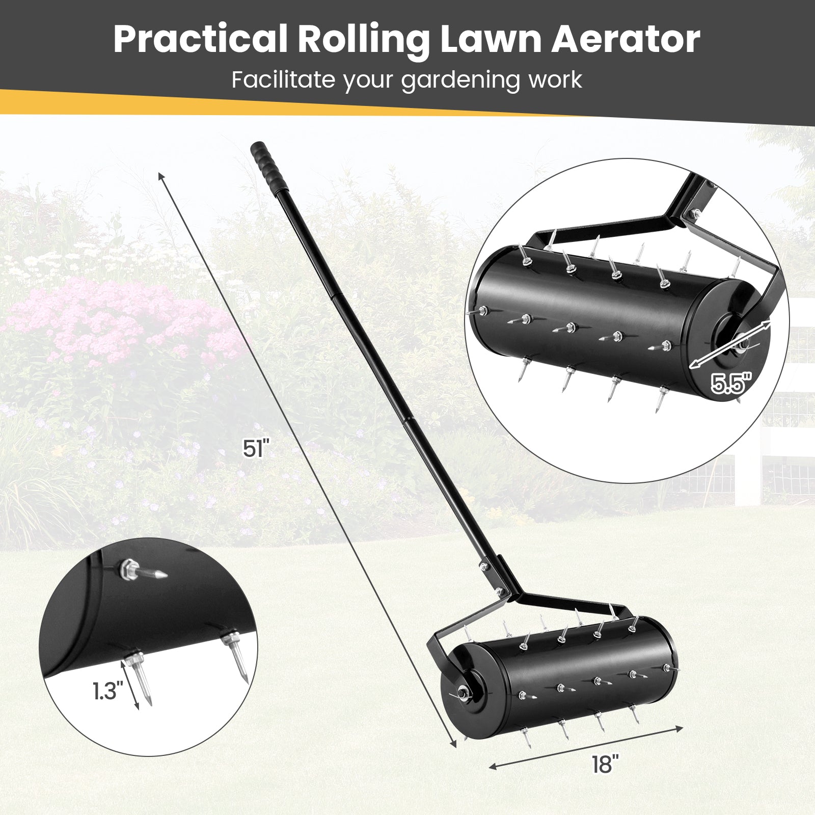 Improve soil aeration and encourage root growth with this durable lawn spike aerator. The 27 galvanized spikes penetrate deeply into all soil types, while the 5.5L fillable drum adds weight for better performance. The ergonomic 51" handle minimizes bending and back strain, and the rust-resistant steel frame ensures long service life. Equipped with a spring-button detachable handle, it assembles and stores effortlessly¡ªideal for gardens, yards, and landscaping projects.