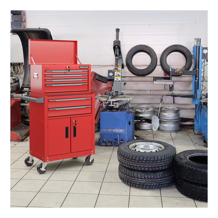 This 2-in-1 rolling tool chest combo features a 24" wide cabinet, detachable upper box, and locking drawers for secure storage. Equipped with smooth-glide drawers, 4" wheels, and a durable steel frame, it's perfect for garages and workshops.