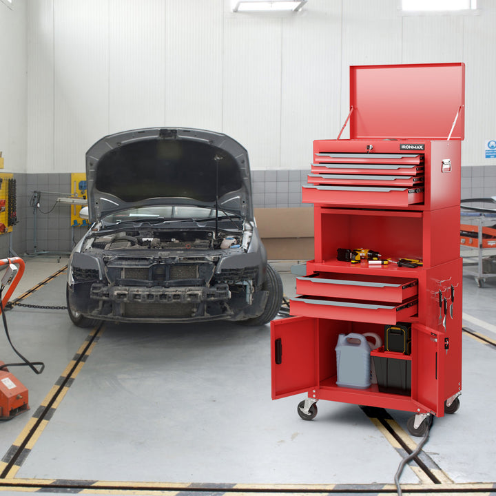 Built for durability and convenience, this wide tool cabinet features multiple drawers, a slide-door middle cabinet, and a detachable top chest for customized use. The heavy-duty frame supports substantial weight, and the 4" wheels roll smoothly. Safety locks protect your tools, while anti-slip liners add stability. Easy to maneuver and built to last, it¡¯s an ideal choice for garage or workshop storage.