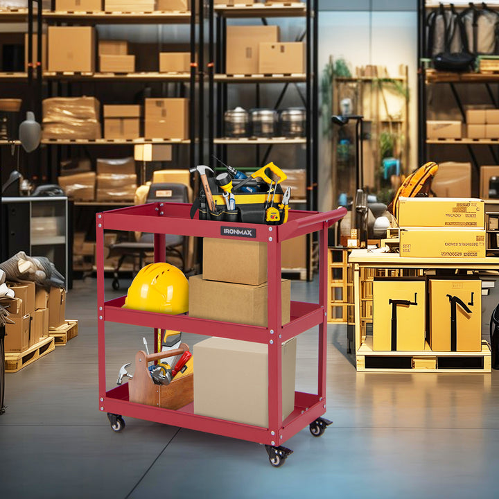 Keep your workspace organized with this heavy-duty 3-tier metal cart. The sturdy frame supports up to 270 lbs and moves smoothly on four swivel casters¡ªtwo lockable for stability. Each shelf has raised edges for added safety, and the side handle doubles as a towel rack or push bar. Ideal for tool rooms, warehouses, or garages, it¡¯s easy to move, practical, and built for daily use.